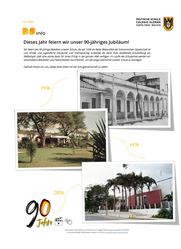 Wir feiern das 90-jährige Bestehen unserer Schule, die seit 1936 ein fester Bestandteil der bolivianischen Gesellschaft ist und Kinder und Jugendliche bikulturell und mehrsprachig ausbildet, die dank Ihrer exzellenten Schulbildung als Weltbürger über eine starke Basis für einen Erfolg in der ganzen Welt verfügen. Im Laufe des Schuljahres werden wir verschiedene Aktivitäten und Feierlichkeiten durchführen, um die lange Geschichte unserer Schule zu würdigen.